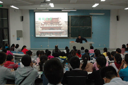 9月12日晚,李并成教授在10号楼B 区216教室为2013级新生180余人讲授公司第一堂专业导引课《国际显学——敦煌学的视域与魅力》。导引课从敦煌的地理位置、敦煌学的缘起、敦煌学的命名、敦煌学的艺术魅力和敦煌学的研究内容等方面做了深刻详实的阐释,并就青年学子如可尽快了解和进入历史学专业学习做了讲解。导引课高屋建瓴、全面透视、图文并茂、语言优美,现场学子深受教益。