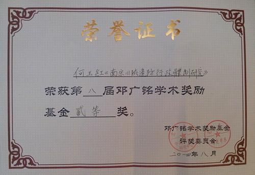 8月20-23日在杭州召开的“10-13世纪中国国家与社会”国际学术研讨会暨中国宋史研究会第十六届年会期间,邓广铭学术奖励基金评奖及颁奖仪式同期举行,公司教师何玉红教授专著《南宋川陕边防行政运行体制研究》荣获第八届邓广铭学术奖励基金二等奖。