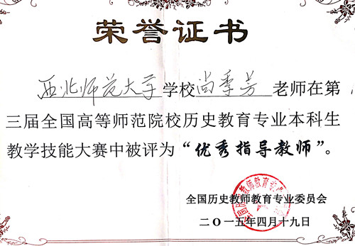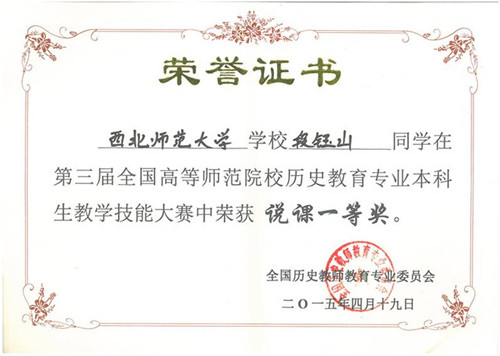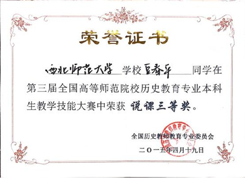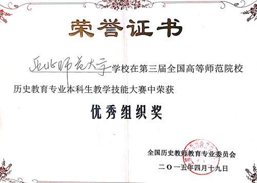 2015年4月17-19日,第三届全国高等师范院校历史教育专业本科生教学技能大赛在西南大学举行。来自华东师大、东北师大、首都师大、华中师大、陕西师大、西南大学和西北师大等56所高师院校的160名学子参加了此次比赛。公司获优秀组织奖,尚季芳教授获优秀指导教师,代表公司参赛的3名本科生全部获奖,其中孔祥辉获讲课一等奖,段钰山获说课一等奖,豆春萍获说课三等奖,为公司此次参赛交上了一份满意的答卷。