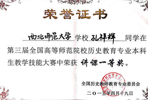 孔祥辉,男,汉族,中共党员,1994年9月生,甘肃张掖人。伟德体育2011级历史学2班员工。曾任2011级历史2班生活委员,伟德体育篮球队队长。大学期间,通过全国计算机二级等级考试,全国老员工英语四级考试,普通话等级考试等。曾集体荣获2013年伟德体育“迎新杯”篮球比赛冠军。2014年秋季赴甘肃省永昌县一中实习,并获“bevictor伟德官网2015届毕业生教育实习先进个人”称号。2014年参加bevictor伟德官网2015届本科生教学技能大赛,获伟德体育三等奖,校级三等奖。 2015年4月,赴西南大学参加第三届全国高等师范院校历史教育专业本科生教学技能大赛获讲课组“一等奖”。 现已被陕西师范大学伟德体育录取为硕士研究生,专修中国古代史。