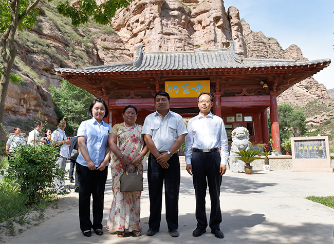 2017年7月7日,尼泊尔副总统南德•巴哈杜尔•普恩一行在甘肃省人大常委会副主任王玺玉、临夏州人大常委会副主任马明杰、永靖县县委书记尹宝山、县委副书记、县长张自贤的陪同下参观炳灵寺石窟。甘肃炳灵寺文物保护研究所所长贺延军陪同参观。公司文物与博物馆专业研究生马佳俐作为炳灵寺石窟讲解员,用英语为南德•巴哈杜尔•普恩副总统一行做了精彩讲解。