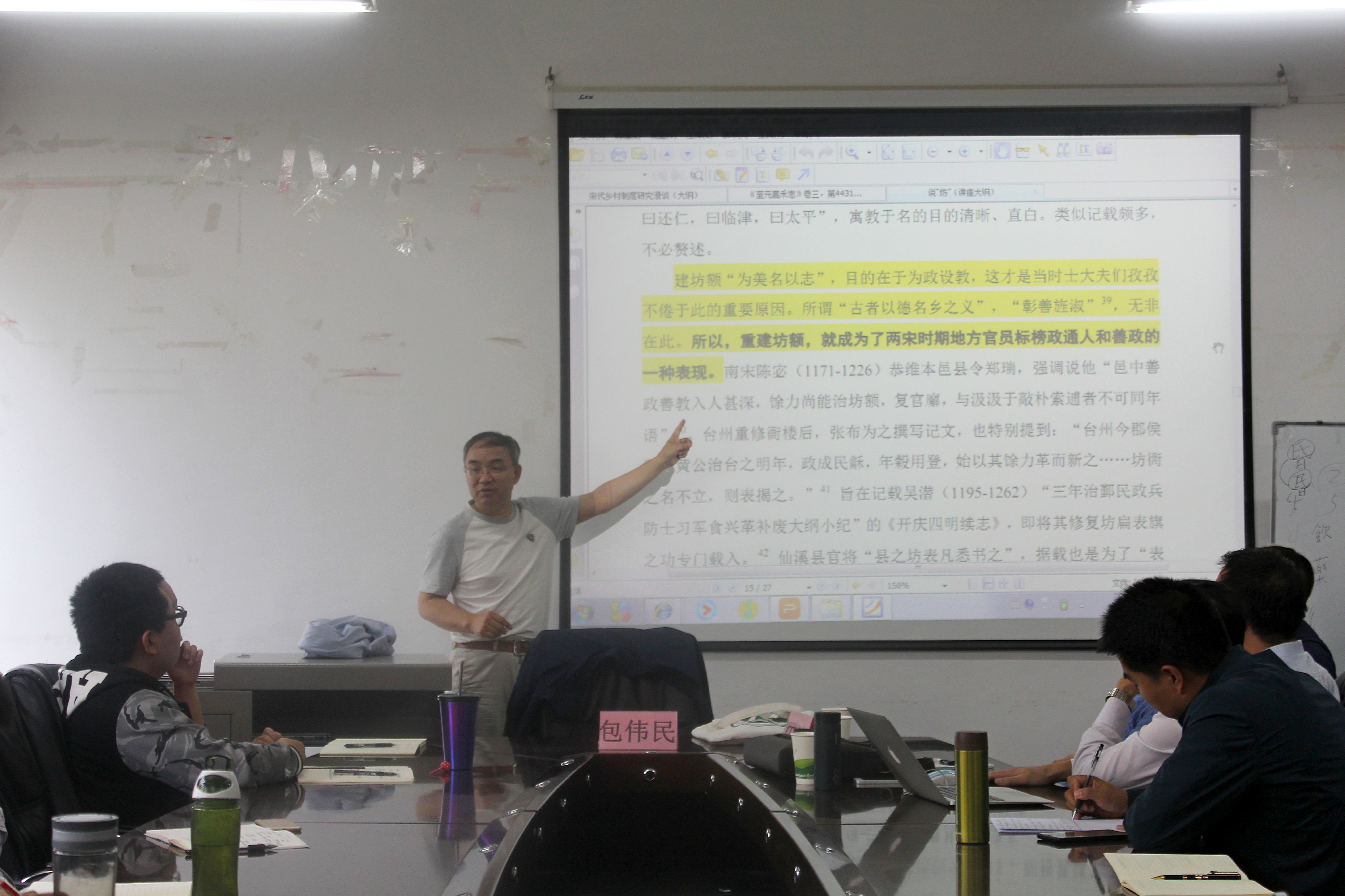 其次,包教授以宋代乡里制度为例讲解了如何进行文本释读。他认为南宋末年文献中较多记载乡里制度的原因是“里”做为行政架构被用作地名,而乡村连户组织实际上是人为给予的网络架构。再次,包教授又通过对宋代“坊”的两种释读阐明我们在进行文本释读时应该了解清楚古人文献表达的重点和政治导向。最后,包教授认为历史研究在选题上应拓宽思路,在方法上应借鉴社会科学的研究方法。
