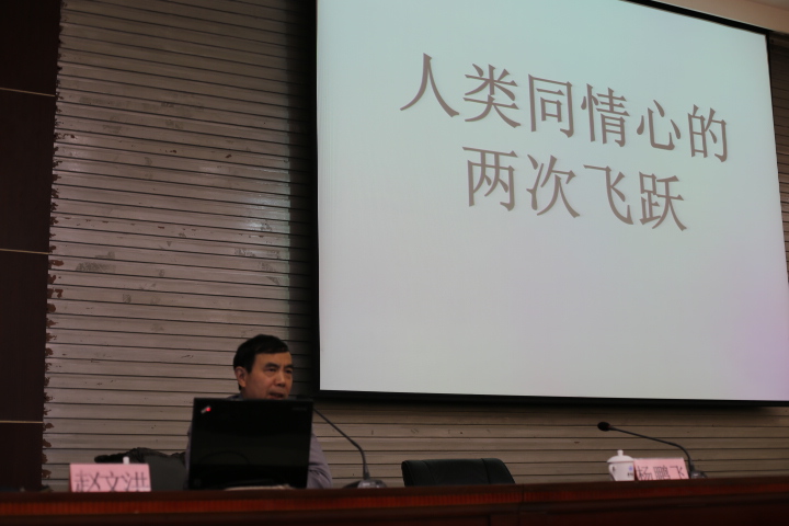 报告中,赵教授指出人类历史上同情心的两次飞跃分别是“中国先秦时期开始出现并一脉相承的对人的同情心”和“近代西方对动物生命的同情心”。赵先生认为原始人类没有对人生命的普遍同情。西周时期,对人生命的同情开始萌芽;孔孟以来,对人生命的普遍同情正式出现,实现了人类历史上同情心的第一次巨大飞跃。其次,随着近代西方人权理念的不断深化,出现了“对动物生命的同情”思想,这一思想不仅强调“动物权利”、“动物福利”,更强调普遍意义上的“生命敬畏思想”和“同情扩展思想”,并指出敬畏生命不仅适用于精神的生命,而且也适用于自然的生命,人越是敬畏自然的生命,也就越敬畏精神的生命,这是人类历史上同情心的第二次飞跃。最后,赵先生通过对“同情心的两次飞跃”的比较分析,认为两者虽存在一定的时空差异,但彼此之间具有相同的原因和价值,因此必须“要永远呼唤和保持对人与动物痛苦的同情”。