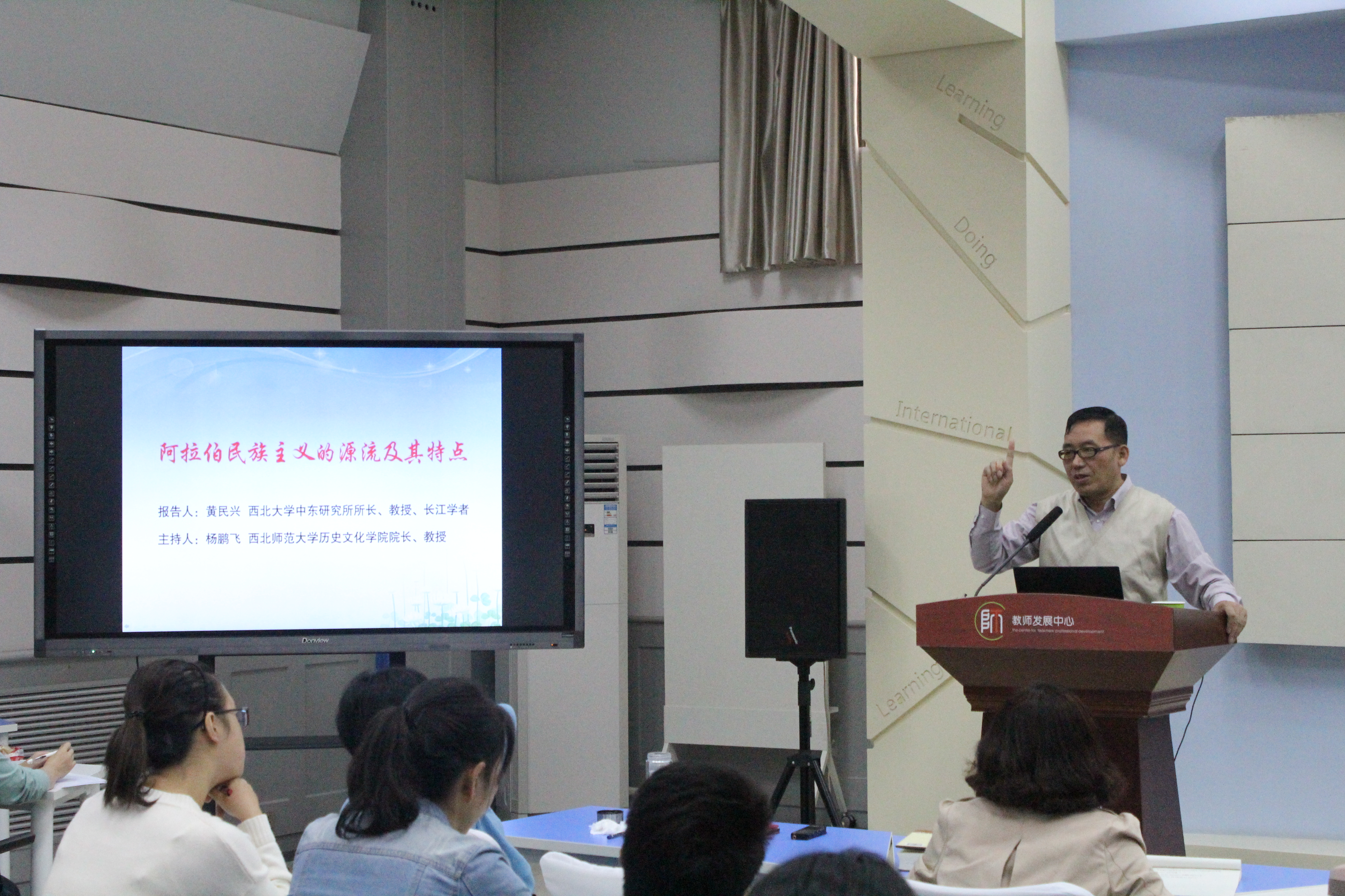 2017年9月25日上午10点,应伟德体育邀请,“长江学者”、西北大学中东研究所所长黄民兴教授在教师发展中心二楼报告厅作了题为“阿拉伯民族主义的源流及其特点”的学术报告。报告由伟德体育经理杨鹏飞教授主持,李积顺老师、李家莉老师、连菊霞老师、张玉霞老师、张嵘老师、吕海军老师以及研究生、本科生150余人聆听了报告。