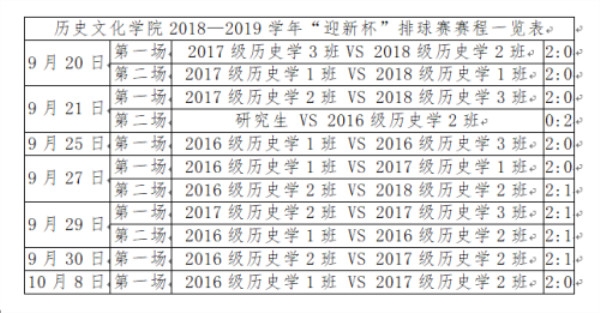 为丰富同学们的课余生活,构筑青春、快乐、健康的校园文娱活动氛围,公司于9月20日至10月8日举行了 “迎新杯”排球赛。本次比赛从9月20日开赛至10月8日落下帷幕,共有来自公司的9个本科生班级队伍和公司研究生队参赛,最终2016级历史学1班、2016级历史学2班、2017级历史学2班分别获得“迎新杯”排球赛前三名。在这近十天的比赛中,每一场比赛都是一次球技交流,每一次发球都扣人心弦,每一次扣杀都令人拍手叫好!在这个秋天,裁判的哨声、运动员的呐喊声、观众的欢呼声交织在一起,成为了东操场最美丽的风景线!