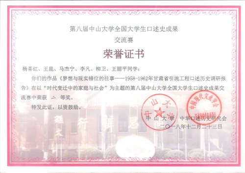公司本科生张波、马杰宁代表口述史协会前往中山大学进行答辩展示,经评委会的认真讨论和严格审核,作品《梦想与现实错位的往事——1958-1962年甘肃省引洮工程口述历史调研报告》以总分第五的优秀成绩荣获二等奖。