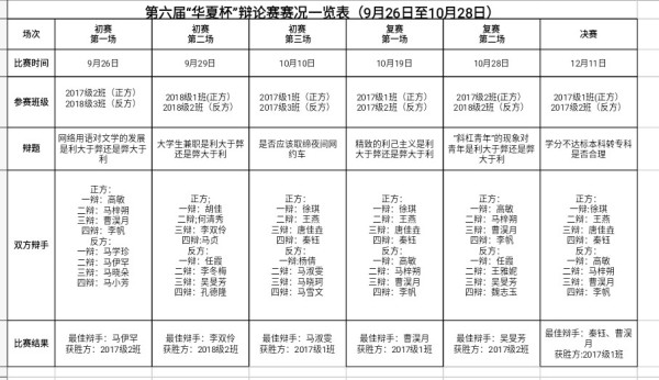 本届“华夏杯”辩论赛,进入复赛的班级有,2017级历史学2班、2018级历史学2班、2017级历史学1班;进入决赛的班级有:2017级历史学1班、2017级历史学2班;最后决赛获胜的班级是2017级历史学1班。获得最佳辩手的同学有:吴旻芳、秦钰、曹淏月、马淑雯、马伊罕、李双伶。