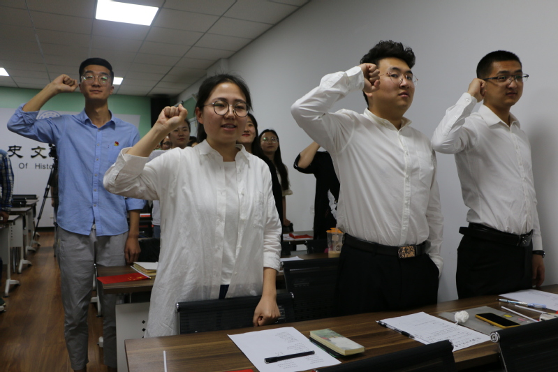 2019届本科毕业生曾磊作为毕业生党员代表做了表态发言。在发言中,他表达了对母校的留念与热爱,表明了在今后工作和学习中努力工作、积极奋斗的决心。接着,李迎新书记带领全体毕业生党员,面向党旗重温入党誓词,牢记并践行自己的誓言,以实际行动发挥党员先锋模范带头作用。