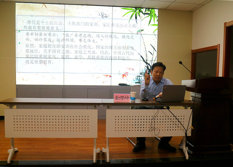 金滢坤教授结合自己多年研究的成果,就魏晋南北朝和唐代的家训、家法、家风与童蒙教育的关系做了系统的阐释。首先,金教授以颜之推的《颜氏家训》为引,为师生详细介绍了王方庄、皇甫七等名门望族的家训家法及对其家族的影响。其次,金教授结合材料概括了以“忠孝、德行、劝学”为主的唐代家训的内容及其特点。最后,金教授从隋唐的兴起、士族兴衰和科举兴盛等视角对唐代士族家训、家风、家法的形成与传承进行了解读。