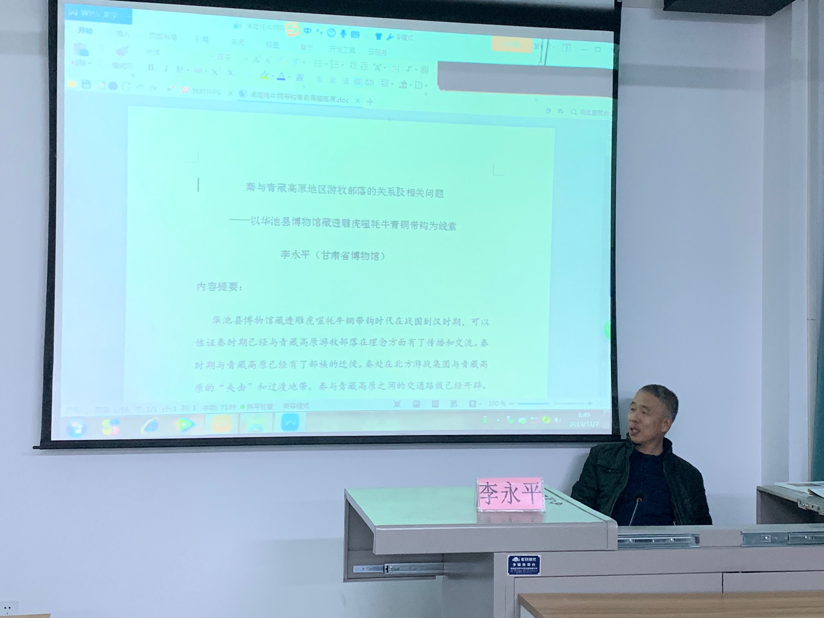 李永平教授首先向同学们讲述了秦时期与青藏高原游牧部落在理念方面的传播与交流。其次,以华池县博物馆藏透雕虎噬牦牛青铜带钩为线索,详细讲述了青藏高原游牧部落所代表的游牧文化与秦文化的相互影响,使同学们清楚的了解到二者之间的联系。最后,李永平教授讲述了以青藏地区为代表的游牧文化对古代西南丝绸之路的影响。