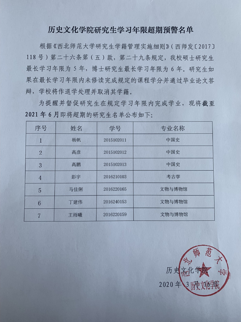 根据《教育部办公厅关于进一步规范和加强公司产品管理的通知》(教研厅〔2019〕1号)、《bevictor伟德官网研究生学籍管理实施细则》(西师发〔2017〕118号)等文件要求,为规范和加强公司研究生学籍管理工作,现将公司2020年春季学期研究生超期预警情况公布如下: