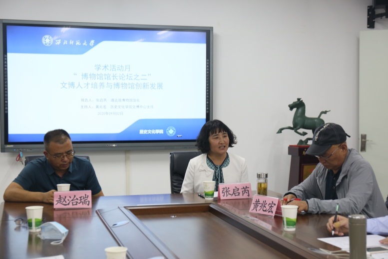 其次,张启芮馆长介绍了靖远县博物馆邀请省内外专家在博物馆开展学术交流的情况,认为学术交流有力地推动了靖远县博物馆的学术发展。最后,张启芮馆长就如何提高博物馆人员的专业水平等问题与在场师生进行交流。