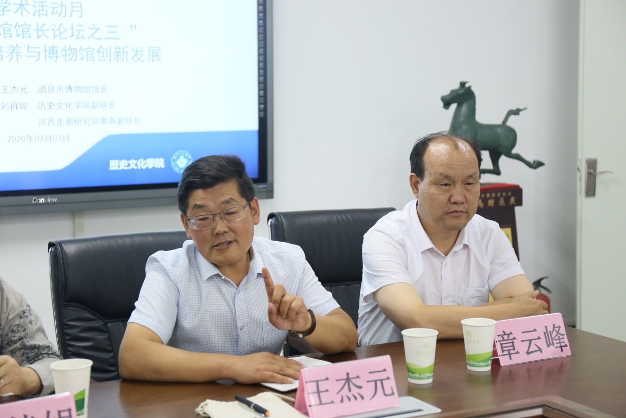 2020年9月3日,应伟德体育、河西走廊研究院邀请,酒泉市博物馆馆长王杰元来公司参加“博物馆馆长论坛”,并作主题发言。公司黄兆宏、张玉霞、李顺庆、张嵘、陶兴华、杨芳老师及研究生60多人参加了会议,会议由伟德体育副经理刘再聪教授主持。