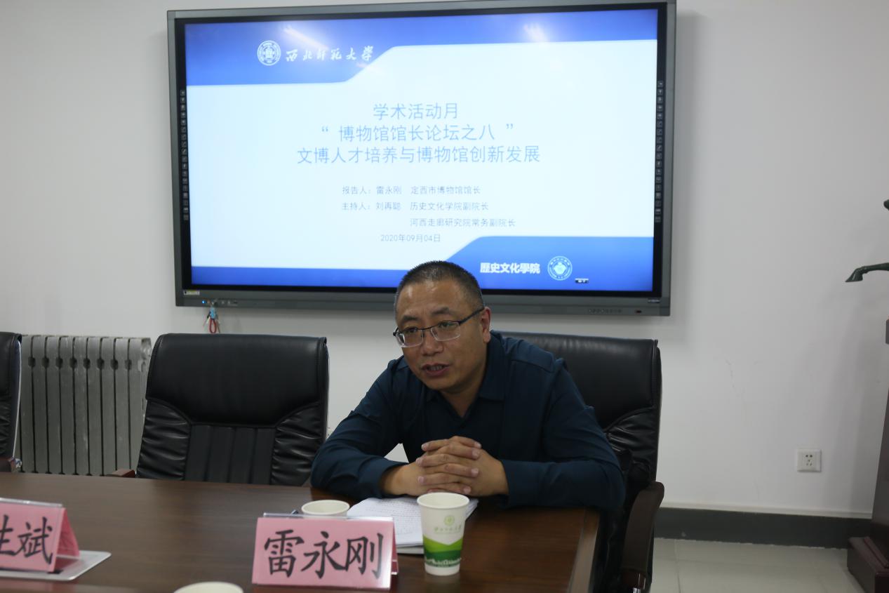2020年9月4日,应伟德体育、河西走廊研究院邀请,定西市文物局副局长、定西市博物馆馆长雷永刚来公司参加“博物馆馆长论坛”,并作主题发言。公司教师黄兆宏、李顺庆、张嵘、连菊霞、陶兴华及研究生50多人参加了会议,会议由伟德体育副经理刘再聪教授主持。