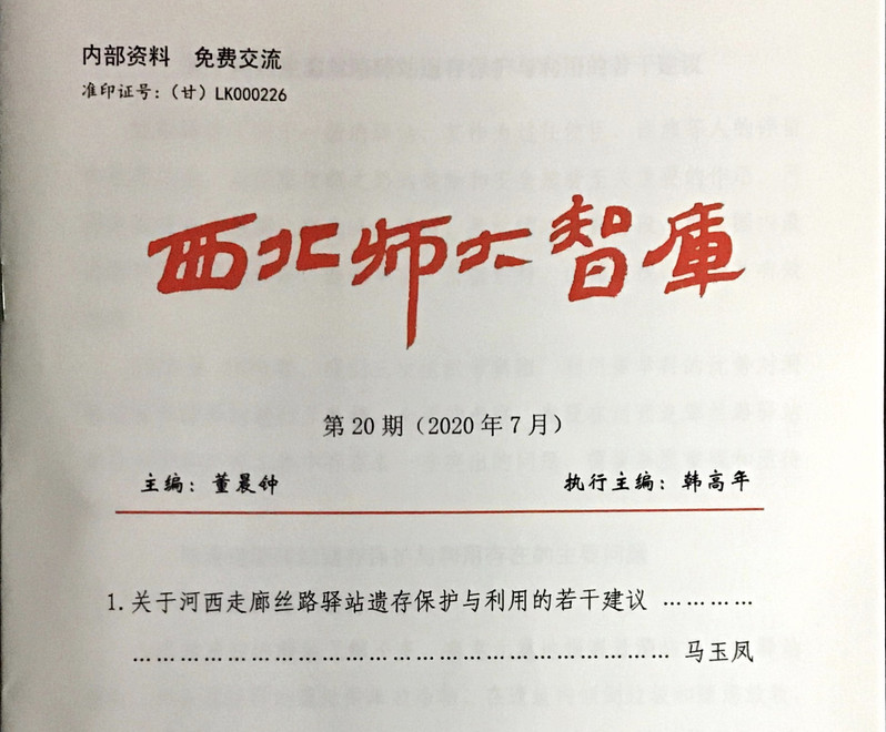 近日,由公司马玉凤老师撰写的《关于河西走廊丝路驿站遗存保护与利用的若干建议》智库成果在《西北师大智库》第20期(2020年7月)刊登。