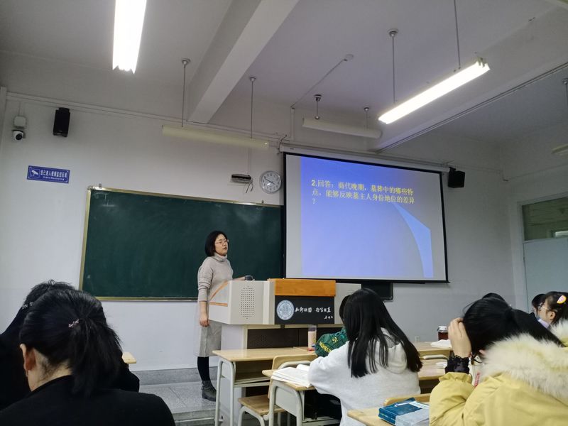 张继刚老师主讲《中国古代史》课程中的“战国变法运动”。张老师先辨析了“战国”概念,然后由史料阅读引导同学们思考春秋与战国时代特点的不同,在此基础上重点讲述了李悝变法和商鞅变法的内容与意义。马军霞老师主讲《考古学概论》课程中的“西周考古”。马老师先带领全班同学复习了西周陶器文化,继而结合地图、现场发掘图片和考古简报讲授了周原、丰镐遗址的情况以及遗址出土的西周青铜器,并组织员工对大口尊的类型演变进行了热烈讨论。