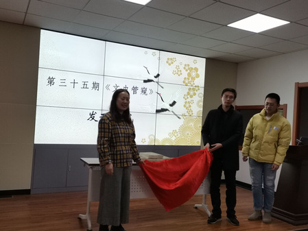 紧接着,由李家莉、郝振宇两位老师共同为第三十五期《文史管窥》揭幕。之后,社长车昱滢对本期《文史管窥》的三个创新点进行了讲解。一是新增杏坛毓苑、流觞曲水、文学鉴赏、毓苑风采等栏目,大大增加了社刊的文学性;二是中外结合,首次加入了世界史的文章;三是在中国史方面,从先秦到现代每一阶段都至少有一篇文章入选。