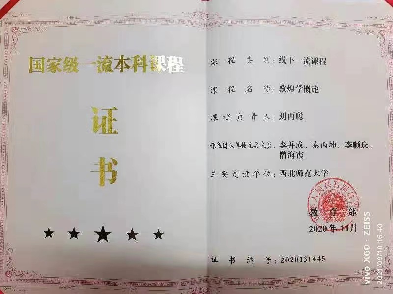 2020年11月,教育部公布了首批国家一流本科课程认定结果,刘再聪教授牵头申报的《敦煌学概论》课程入选。《敦煌学概论》课程团队主要成员为李并成研究员、秦丙坤副教授、李顺庆副教授和僧海霞教授。“敦煌学”是公司特色课程,此次入选,是李并成教授团队教学工作取得的又一重大成就。