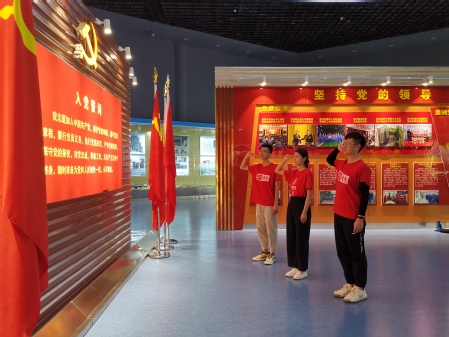 学习百年党史,追忆奋斗征程。7月19日上午,实践团师生走进酒钢展览馆,先后参观了酒钢建设发展历程展览和党史陈列展览。在酒钢发展建设成就展厅,实践团师生跟随讲解员通过观看专题宣传片、历史照片、实物资料、产品展示,深刻感受了“酒钢人”在艰苦环境中勇于献身、开拓前进的奋斗精神和发展振兴新中国工业的家国情怀。在参观完党史陈列室后,实践团队开展了以“追忆峥嵘岁月、感受大国力量”为主题的党史学习教育,全体党员面对鲜艳的党旗,重温入党誓词。誓言铿锵,激昂回响,更加坚定了青年员工党员听党话、跟党走的理想信念。