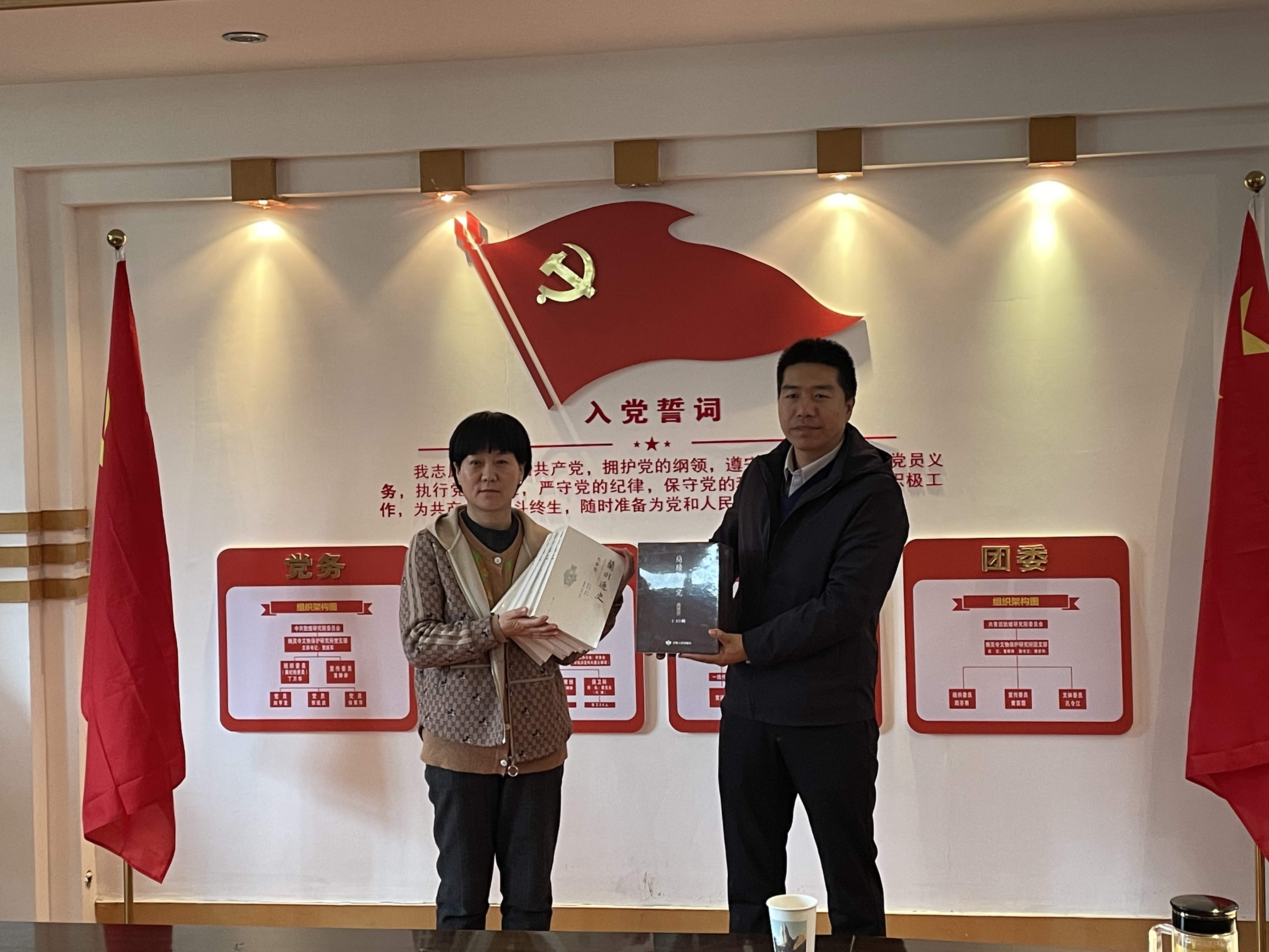 康智杰书记为炳灵寺文物保护研究所授牌、张继刚副经理赠送《简牍学研究》《兰州通史》等书籍。