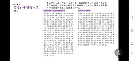 在五位同学做完读书报告之后,其他同学也积极分享了自己读书的心得。马世霞同学提到做皇帝的无奈,看似拥有至高无上的权利,实则受到整套制度体系的约束,理想难成,内心苦闷;马子康同学认为:一、黄仁宇先生的“大历史”注重群众运动对社会上的长期贡献,是不是可以加入一个典型下层群众的形象,以此来观察群众对历史的反应?二、书中提到明朝以道德代替法律来治理国家,这种说法有些偏离。法律不可能被代替,而依附于道德上。三、都是以儒家道德为守的海瑞和文官集团是互不相容的,因为前者存在理想主义而后者存在利己主义;杜馨安同学认为后期张居正的失势,是他缺少自己对实际情况的判断,以大刀阔斧地改革打破了文官体系平衡,受到文官集团攻击,后任首辅申时行则作为一个“和事佬”来平衡。最后,陈老师进行了总结点评,认为我们在读书、写作的时候要有“大历史”的自觉,对于黄仁宇的“大历史观”要包容、批判地理解,我们更应该以“大历史”的视野深耕“人事”与“制度”。