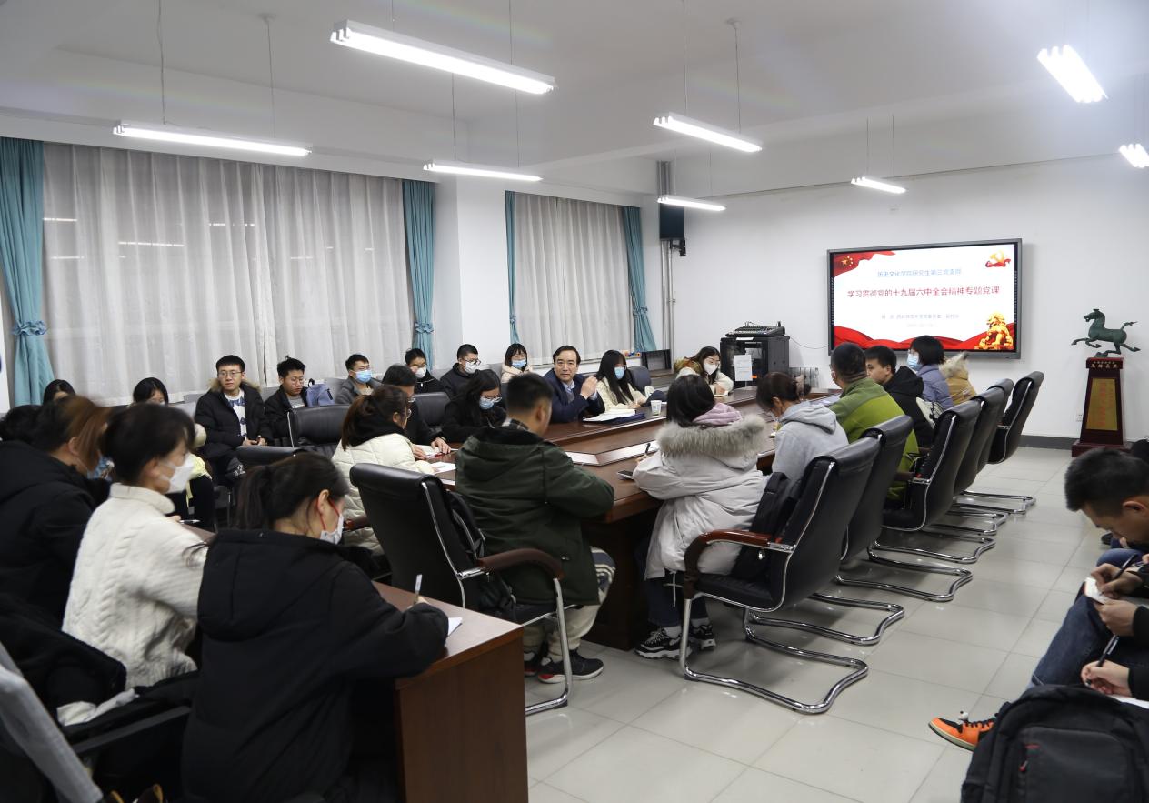 2021年12月21日晚,bevictor伟德官网党委常委、副董事长田澍教授在田家炳教育书院314会议室为公司研究生第三党支部讲授党的十九届六中全会精神专题党课,研究生第三党支部全体党员参加。党课由研究生第三党支部书记郝振宇主持。