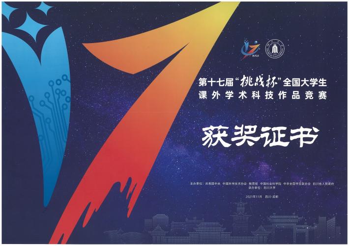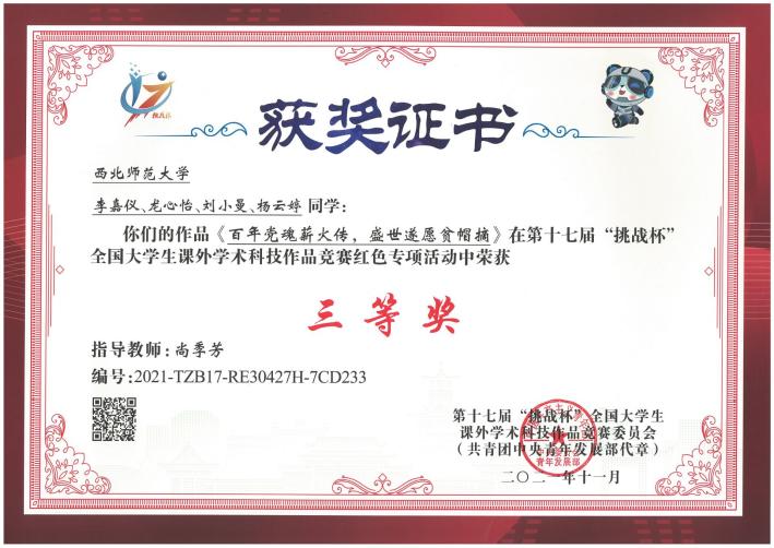 为献礼建党百年,赓续红色精神,2021年11月,由共青团中央、中国科学技术协会、教育部、中国社会科公司、中华全国公司员工联合会、四川省人民政府共同主办的第十七届“挑战杯”全国老员工课外学术科技作品竞赛红色专项活动在成都落幕,由公司尚季芳教授指导,李嘉仪、龙心怡、刘小曼、杨云婷同学参加的作品《百年党魂薪火传,盛世遂愿贫帽摘》荣获三等奖。