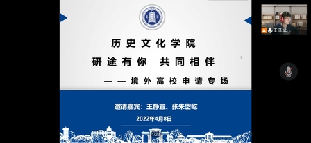 你是否对境外留学的生活充满好奇?你是否向往进入世界名校来提升自我、丰富人生?为了增长对境外学习和生活的了解,拓宽历院学子的求学视野,伟德体育于4月8日晚举办了境外高校申请分享会。本次分享会邀请到2021届毕业生王静宜和2018级历史学2班张朱岱仡进行线上分享,分享会由辅导员王泽斌主持,辅导员付蓉及200余名本科生参加会议。