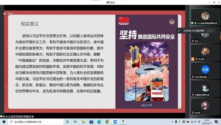 会议伊始,张文骐同学对我国全民国家安全教育日的建立背景、发展历程进行概述。团委书记王浩围绕“树牢总体国家安全观,感悟新时代国家安全成就,为迎接党的二十大胜利召开营造良好氛围”这一主题展开宣讲,并对国家安全教育的总体国家安全观进行讲解。总体国家安全观突出的是“大安全”理念,强调了做好国家安全工作的系统思维,既是认识论又是方法论,既强调综合性,又注重立体性,既有布局也有方法,其鲜明特征更在于“总体”二字上。因此,国家安全不是多个领域安全的简单叠加,而是一张布满有机链条的网络,环环相扣,绝不能一叶障目。同时,从近期频发的诈骗事件,同学们要敲响反诈警钟,提高个人防诈意识,学会辨明防诈手段,做到维护个人安全和国家安全的双重任务。
