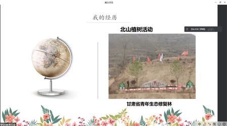 紧接着,马梓萱同学介绍在甘肃永登各个乡镇,机关干部和志愿者们贯彻实施国土绿化行动,采用工程造林与义务植树相结合的方法,将国土绿化与人居环境整治紧密相连,展现了美丽宜居的永登幸福家园。
