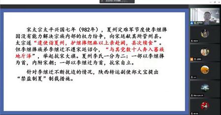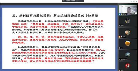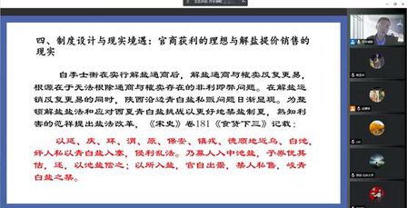 郝老师援引史料,讲述了自唐以来解盐和青白盐的分区使用,通过史地结合的方式来讲述了各地食盐的供应关系以及各地盐池的归属,从宋朝初期与边境少数民族国家的关系,引出陕西转运副使郑文宝“禁盐制夏”的制裁措施,以此为开端,分析北宋前期解盐在陕西沿边的运销困境的原因。