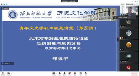 伟德体育青年文史学社第二十八期毓苑讲堂于2022年4月26日晚19:30在线上进行。公司郝振宇老师为大家带来题为《北宋前期解盐在陕西沿边的运销困境与原因分析——以商利与邦计为中心》的讲座,社团社长祝一丹同学担任主持人,并进行了开场讲解。我社社员以及校内外对此题感兴趣的同学及社会人士聆听了此次讲座。