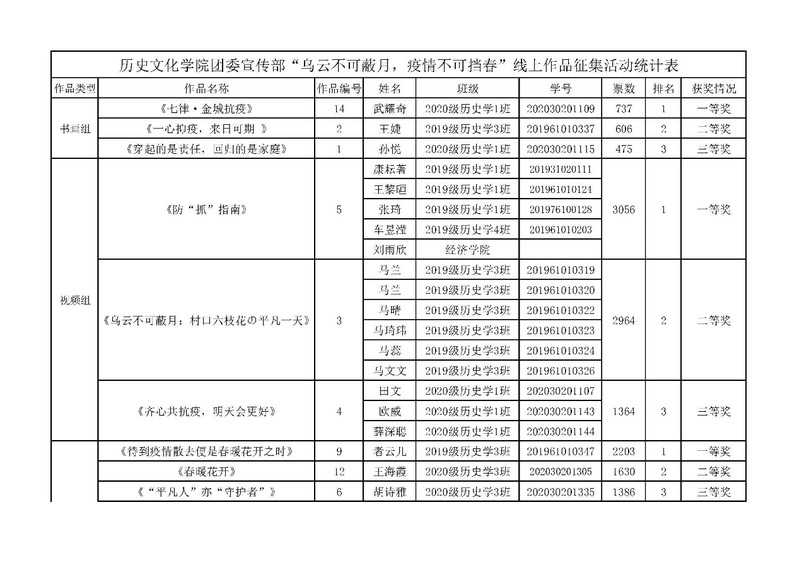 此次防疫主题线上活动受到了同学们的热情关注和参与,共14份优秀作品进入投票环节,其中摄影组8份,视频组3份,书画组3份。书法作品《七律▪金城抗疫》以诗歌为载体,赞颂全力以赴的医护人员、兢兢业业服务的志愿者、配合工作的市民等等在此次战疫中付出巨大努力的人们和这座伟大的城市,代表的是我们对战疫必胜的坚定信念。视频作品《防“抓”指南》通过三个场景展现疫情期间违反防疫规定的动作:翻墙擅自离校、不戴口罩聚集、不特通行卡出入宿舍。团队成员希望通过诙谐幽默的表演,提醒同学们不可越过防疫红线,提高疫情期间遵守公司防疫规定的意识。摄影作品《待到疫情散去,便是春暖花开之时》以鲜花代表生命力,以口罩代表疫情,希望鲜花可以冲破口罩,把春的气息带给大家,表达了学子对战疫胜利的期许。公司员工通过网络平台,认真观看了所有作品并积极开展投票工作,最终结果如下: