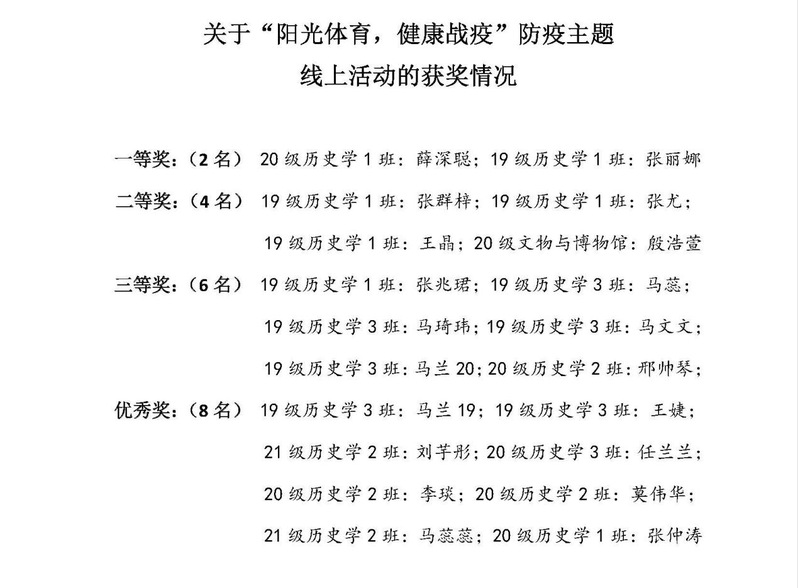 在众多运动投稿中根据排名最终确定了20名获奖同学,分别有20级历史学1班薛深聪等2名同学获一等奖、19级历史学1班张群梓等4名同学获二等奖、19级历史学1班张兆珺等6名同学获三等奖、19级历史学3班马兰等8名同学获优秀奖。