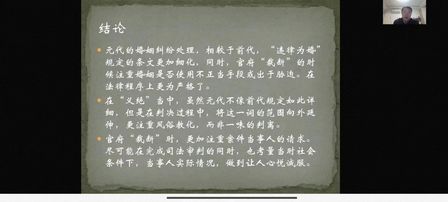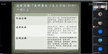 刘晖老师从“元代婚姻的基本程序”开始讲起,援引史料,从“违律为婚”“义绝断离”两个层面讲述了元朝时期的婚姻纠纷。其次,刘老师通过对史料的分析,为我们介绍了元代法律制度在实践过程的变化。婚姻是家庭的基础,家庭又是社会的细胞,在当时小农经济形态下的元朝社会,是必须要重视这一点的。这些婚姻政策方面的相关法律体现出了当时元朝的等级制度,以及汉族和少数民族风俗的交替融合,呈现出元朝的经济形态以及与社会发展状态。