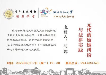 伟德体育青年文史学社第二十九期毓苑讲堂暨百廿校庆纪念讲座于2022年5月17日晚19:30在线上进行。公司刘晖老师为大家带来题为《元代的婚姻纠纷与法律实践》的讲座,社团宣传部负责人赵薇同学担任主持人。我社社员和校内外师生、社会人士共聚云端,参加了本次讲座。