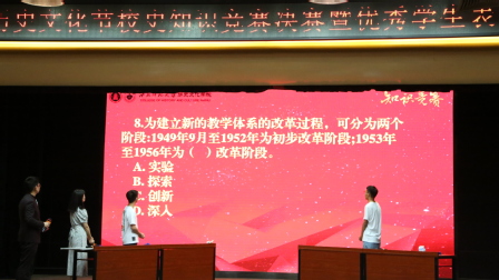 在欢快的舞蹈《寄明月》后,知识竞赛拉开帷幕。本次竞赛共分四个环节,分别为和衷共济、分秒必争、擂主争霸、谁与争锋。在和衷共济环节中,十二名选手两两为一组,进行回答。图片题、音频题均为今年新增题型,趣味良多,使同学们对于校史、师大校园生活有更充分的了解。第二轮分秒必争以抢答形式展开,上一轮获胜的四支队伍竞相抢答,现场的气氛变的更加热烈。该环节最重要的是“拼手速”,现场的选手和观众都聚精会神,焦灼地等待主持人的那声“请抢答”,台上连连抢答,台下啧啧赞叹,气氛一度达到高潮。随后,公司张文骐同学演唱歌曲《钢的琴》,舒缓婉转的歌声醉人心扉,现场的各位都深深的沉浸在歌声里。