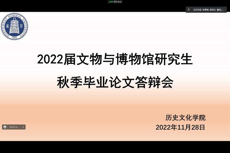 2022年11月28日晚,伟德体育在线上举行2022届文物与博物馆专业硕士研究生秋季学位论文答辩会。答辩委员会主席由兰州大学张景峰教授担任,委员有高台县博物馆高启安研究员、寇克红副研究员、嘉峪关长城博物馆张晓东研究员、炳灵寺文物保护研究所曹学文副研究员,以及bevictor伟德官网黄兆宏、陶兴华老师,答辩秘书由慕占雄老师担任。