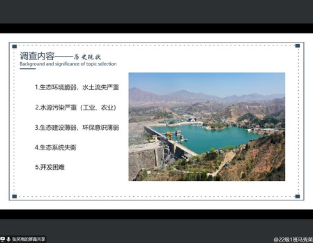 “黄河历史变迁与治理”团队从永靖县刘家峡水库入手,有重点地进行考察该流域曾经面临的生态和发展问题,了解黄河甘肃段的治理历程与成效,总结概括当地的治理经验,分析黄河治理过程与措施对周边地区人民的影响,以此对整个黄河流域的治理提供建议。通过提出持续黄河流域生态投入,把握甘肃高质量发展机遇和完备搭建甘肃黄河流域生态责任体系,明确各方主体责任等措施为黄河流域生态环境脆弱、水土流失严重、水源污染严重、生态建设薄弱、环保意识薄弱、生态系统失衡、开发困难等问题建言献策。