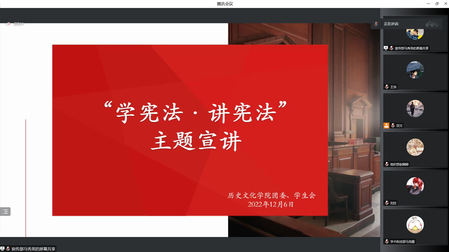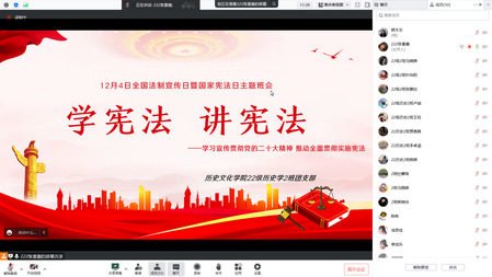 伟德体育团委、员工会于12月6日晚组织员工会全体成员进行“学宪法,讲宪法”宣讲活动,引导员工深入学习宪法知识。本次活动以“学习宣传贯彻党的二十大精神,推动全面贯彻实施宪法”为主题。全面贯彻习近平新时代中国特色社会主义思想,深入学习贯彻习近平法治思想和习近平总书记关于宪法的重要论述,引导全体员工工作者做社会主义法治的忠实崇尚者、自觉遵守者、坚定捍卫者,努力使尊法学法守法用法之风在全校普及。