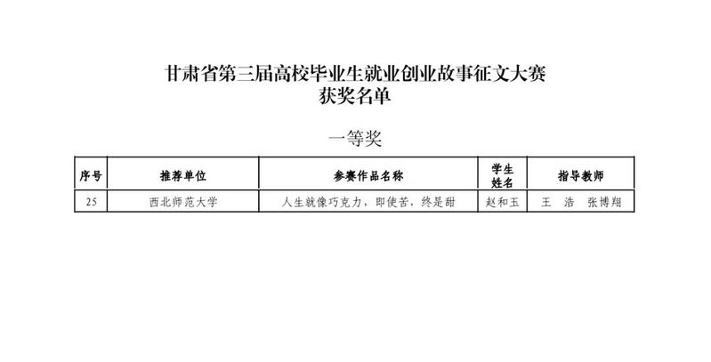 近日,由甘肃省教育厅主办的甘肃省第三届高校毕业生就业创业故事征文大赛获奖名单公布,公司2019级本科生赵和玉作品《人生就像巧克力,即使苦,终是甜》荣获省级一等奖,指导教师为王浩老师和张博翔老师。
