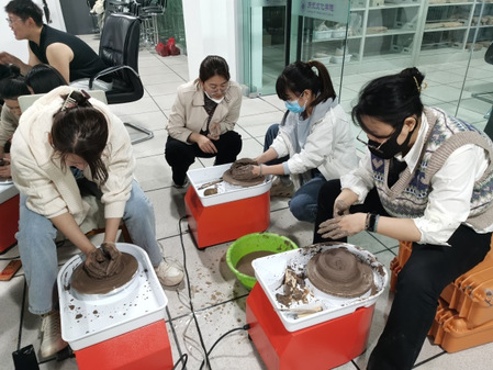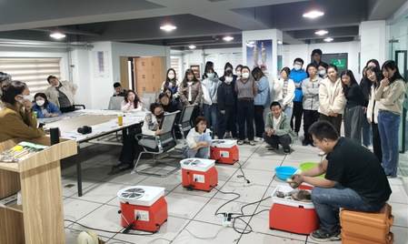 本次报告分两部分:报告前半场,原老师讲解制陶工艺中的手制法与轮制法。手制法重点展示了泥条盘筑法,从陶泥的选择、切割入手,再从泥条制作、盘筑、粘合等注意事项展开,并作演示说明;轮制法先从泥坯与轮盘贴合、拉坯姿势与力度、轮盘转速与转向等方面的控制来保证拉坯的成功率,再从慢轮修整、坯体切割、坯体阴干等方面讲解注意事项,使同学们对轮制法这一制陶技术有了更直观的认识。报告后半场,同学们应用所学及时开展泥条盘筑法和轮制法的制陶实验,原老师在现场进行技术指导。