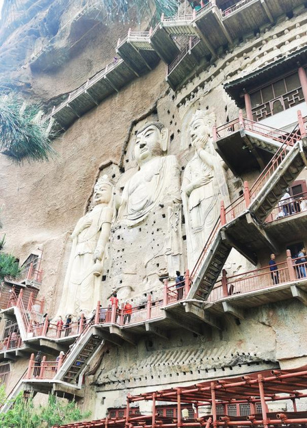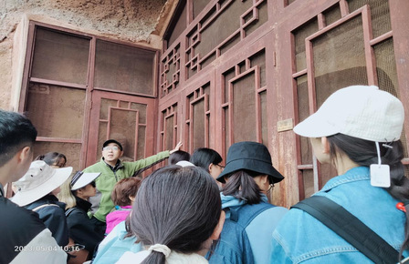 以丰富的背景知识为基础,同学们随后在项老师的带领下,参观了麦积山石窟造像。项老师以第133窟(北魏),第44窟(西魏),第4窟(北周),第135窟(隋代)等重要洞窟为中心,对洞窟的断代、形制、主要内容做了讲解。其中,第4窟又名“散花楼”、“上七佛阁”,是北周时秦州大都督李充信为其祖父祈福所建,七间八柱的构造形制,磅礴恢弘,是国内石窟寺目前保存最好、规模最大的木制宫殿式建筑,具有重要的文物保护价值。