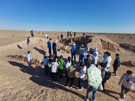 考察成员实地考察汉代甲渠候官(A8)、甲渠塞第9隧、T14烽燧,卅井候官(P9)、卅井塞T117烽燧、T118烽燧,肩水都尉府(东大湾城A35)、肩水候官(地湾A33)、肩水金关(A32)等简牍出土地,和K688(雅布赖城)、K710、绿城、绿城城东汉墓群等汉代城址、墓葬,以及黑城等代表性文化遗迹。在各遗址点中,成员通过沈刚教授、刘国胜教授、李迎春教授、赛音达来主任的讲解,详细了解居延一带的遗址面貌、出土简牍及保护情况。